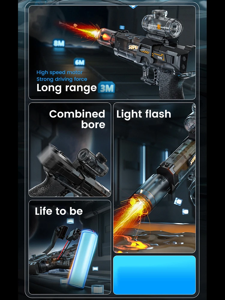 【Powerful Electric Drive】Dominate your water battles with a powerful electric drive system that delivers strong and consistent water streams. With an enhanced shooting range , you can hit targets from a distance, giving you a competitive edge.